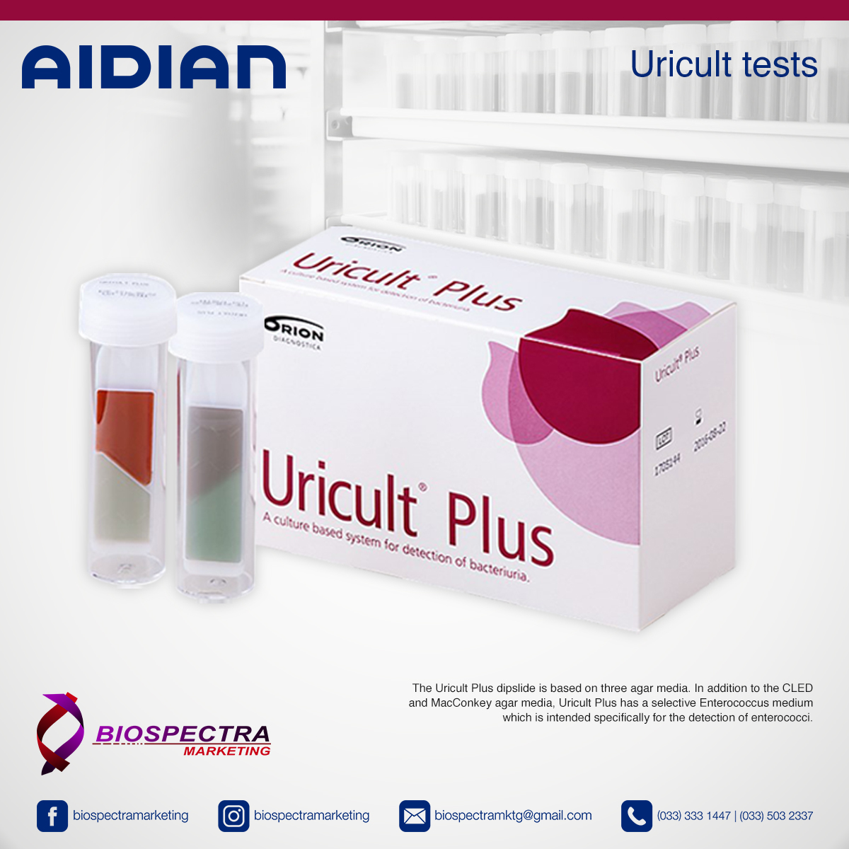 The Uricult Plus dipslide is based on three agar media. In addition to the CLED and MacConkey agar media, Uricult Plus has a selective Enterococcus medium which is intended specifically for the detection of enterococci.