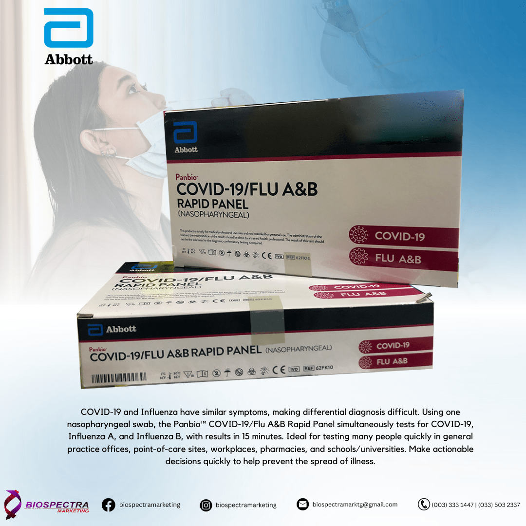 COVID-19 and Influenza have similar symptoms, making differential diagnosis difficult. Using one nasopharyngeal swab, the Panbio™ COVID-19/Flu A&B Rapid Panel simultaneously tests for COVID-19, Influenza A, and Influenza B, with results in 15 minutes. Ideal for testing many people quickly in general practice offices, point-of-care sites, workplaces, pharmacies, and schools/universities. Make actionable decisions quickly to help prevent the spread of illness.