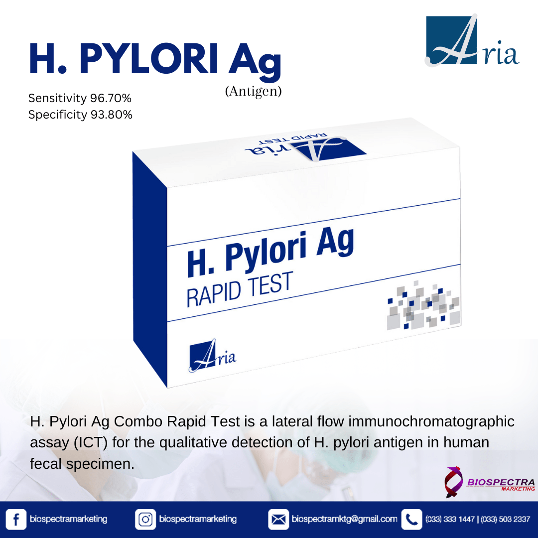 The Aria H. Pylori Ag Combo Rapid Test is a lateral flow immunochromatographic assay (ICT) for the qualitative detection of H. pylori antigen in human fecal specimen.