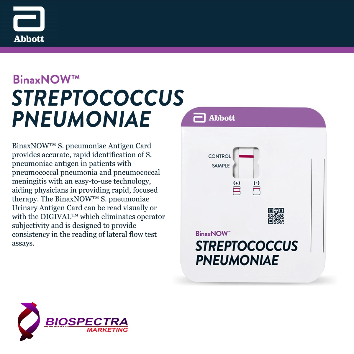 BinaxNOW™ S. pneumoniae Antigen Card provides accurate, rapid identification of S. pneumoniae antigen in patients with pneumococcal pneumonia and pneumococcal meningitis with an easy-to-use technology, aiding physicians in providing rapid, focused therapy. This can lead to reducing healthcare costs, improving patient outcomes and aiding in the global fight against antibiotic resistance.